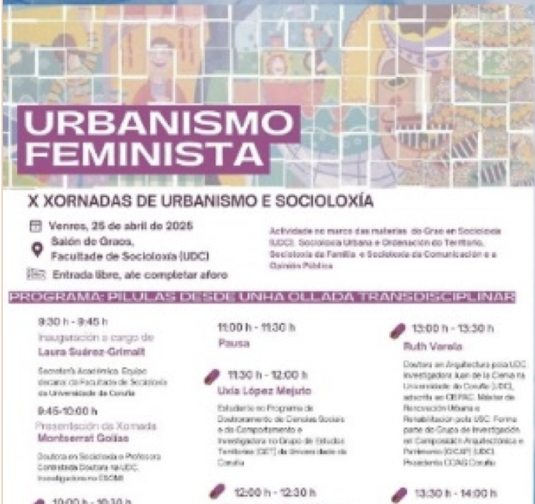 Tipo de actividade: Xornadas Título: X Xornada de Urbanismo e Socioloxía “Urbanismo Feminista” Entidade convocante: Universidade da Coruña Lugar: Facultade de Socioloxía (UDC) (A Coruña) Datas de realización: 25/04/2025